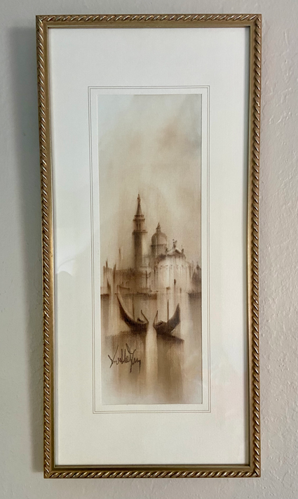 One of my favorite methods for collecting art is to acquire it gradually while traveling. When you purchase art while traveling you are getting not just a piece of art, but an entire memory. Every time you look at that piece, you will be transported back to a place, experience, or a moment in time that brought you joy. I purchased this sepia-tone drawing on linen from a street vendor while vacationing in Venice. I then took it to a frame shop around the corner from my apartment on East 85th Street in Manhattan. I don't remember exactly what I paid, but I'd estimate that the custom matting and frame cost 5 times more than the art itself. For me, it was worth it. The frame elevated and enhanced the original art, and I now proudly display it on my mantel. (I had to move it to a random wall for the purpose of this blog post because my amateur photo shoot was resulting in too much glare.)